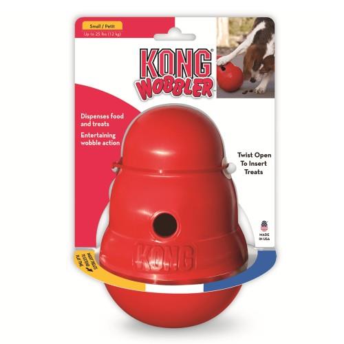 The KONG Wobbler?is an action-packed toy that is a mentally stimulating food dispenser. The KONG shaped toy sits upright until nudged by the dog’s paw or nose, dispensing tasty rewards as it wobbles, spins and rolls. The unpredictable movement stimulates natural instincts keeping even the most seasoned users challenged. The KONG Wobbler?can also be used as an alternative to a dog bowl to help extend mealtime while providing exercise for your dog. Trying to get your dog to lose a few unwanted pounds? The KONG Wobbler?is a great way to keep dogs moving while making them work for their food. ?Unscrews for easy filling and cleaning. Use the large Wobbler?? for medium to large-sized dogs ? Product details Unpredictable and entertaining wobble movement makes toy fun and engaging and sparks dogs curiosity action packed food-dispensing toy that provides mental stimulation allows dogs to work for their food, engaging in natural instincts small size fits 1/2 cup of food dispenses treats from single exit point top shelf dishwasher safe unscrews easily for filling made of FDA food-approved, strong plastic polymer made in the USA prevents rapid feeding.