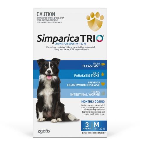 Simparica Trio Medium 10.1-20kg?is a tasty combination chew for dogs with vet grade protection and provides triple protection against a trio of the biggest?threats facing our dogs. Fleas and ticks, intestinal worms and deadly heartworm. Product details Kills fleas before they can lay eggs – preventing your dog and home from flea infestation controls Flea Allergy Dermatitis?(FAD) – bringing relief to your itchy dog treats and controls paralysis ticks, bush ticks?and brown dog ticks – minimising risk of paralysis and infection has persistent flea and tick killing activity for 5 weeks (35 days) is 100% effective at preventing deadly heartworm disease with monthly administration treats and controls hookworms and roundworms – including larval stages, reducing risk of?transmission to other members of the family treats and controls demodex, sarcoptes and otodectes mites pork liver-flavoured chew that dogs eat willingly and?can be given with or without food prevents flea tapeworm infestations can safely be given?to puppies from 1.25kg and from 8 weeks of age.