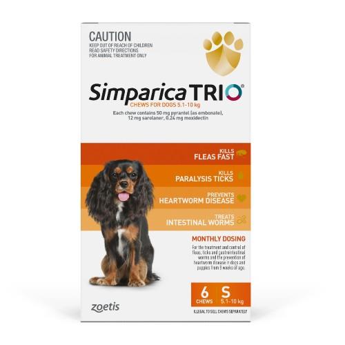 Simparica Trio Small 5.1-10kg is a tasty combination chew for dogs with vet grade protection and provides triple protection against a trio of the biggest?threats facing our dogs. Fleas and ticks, intestinal worms and deadly heartworm. Product details Kills fleas before they can lay eggs – preventing your dog and home from flea infestation controls Flea Allergy Dermatitis?(FAD) – bringing relief to your itchy dog treats and controls paralysis ticks, bush ticks?and brown dog ticks – minimising risk of paralysis and infection has persistent flea and tick killing activity for 5 weeks (35 days) is 100% effective at preventing deadly heartworm disease with monthly administration treats and controls hookworms and roundworms – including larval stages, reducing risk of?transmission to other members of the family treats and controls demodex, sarcoptes and otodectes mites pork liver-flavoured chew that dogs eat willingly and?can be given with or without food prevents flea tapeworm infestations can safely be given?to puppies from 1.25kg and from 8 weeks of age.